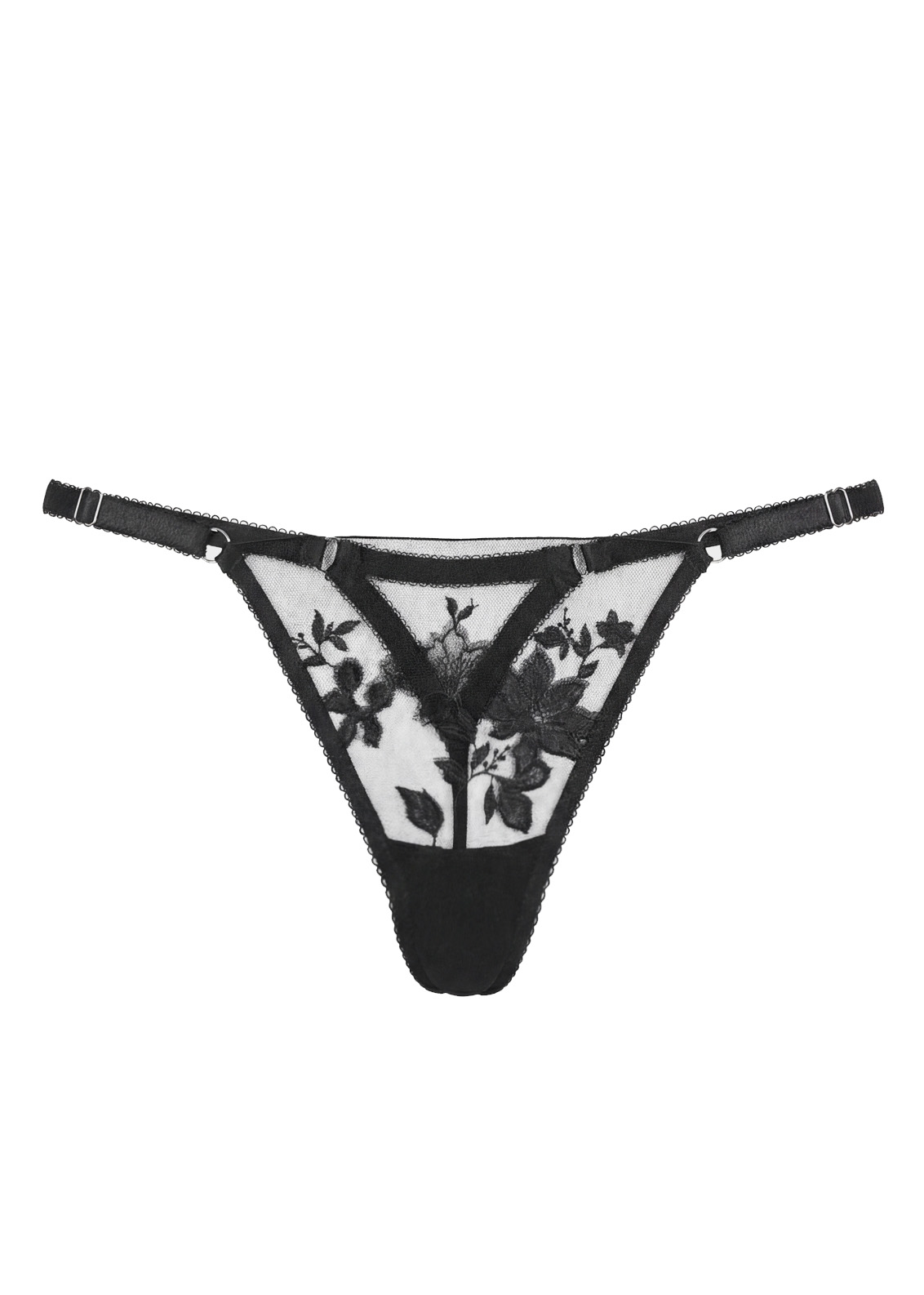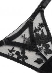 Черные трусики-стринги из полупрозрачного кружева с вышивкой спереди . Лёгкая прозрачность добавляет образу интригу, а минималистичный крой делает... Показать полностью