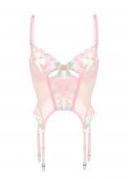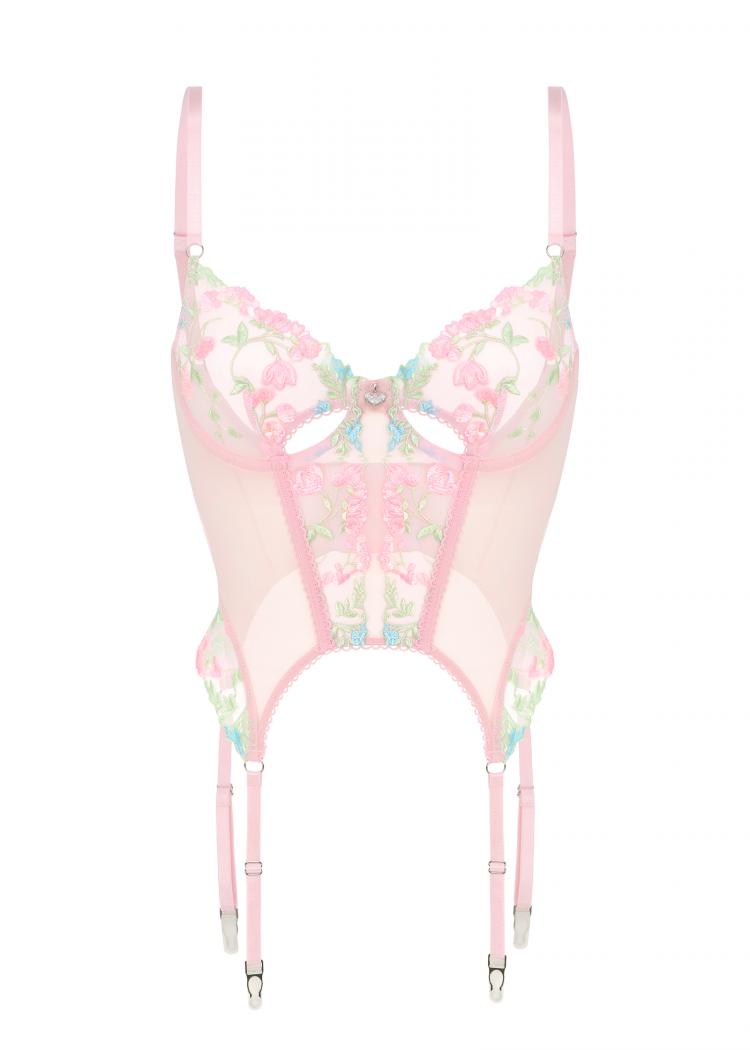 Грация из нежнейшей сеточки с цветочным кружевом, акцент вырезов и кулона в виде сердца между чашек задает провокационное настроение.