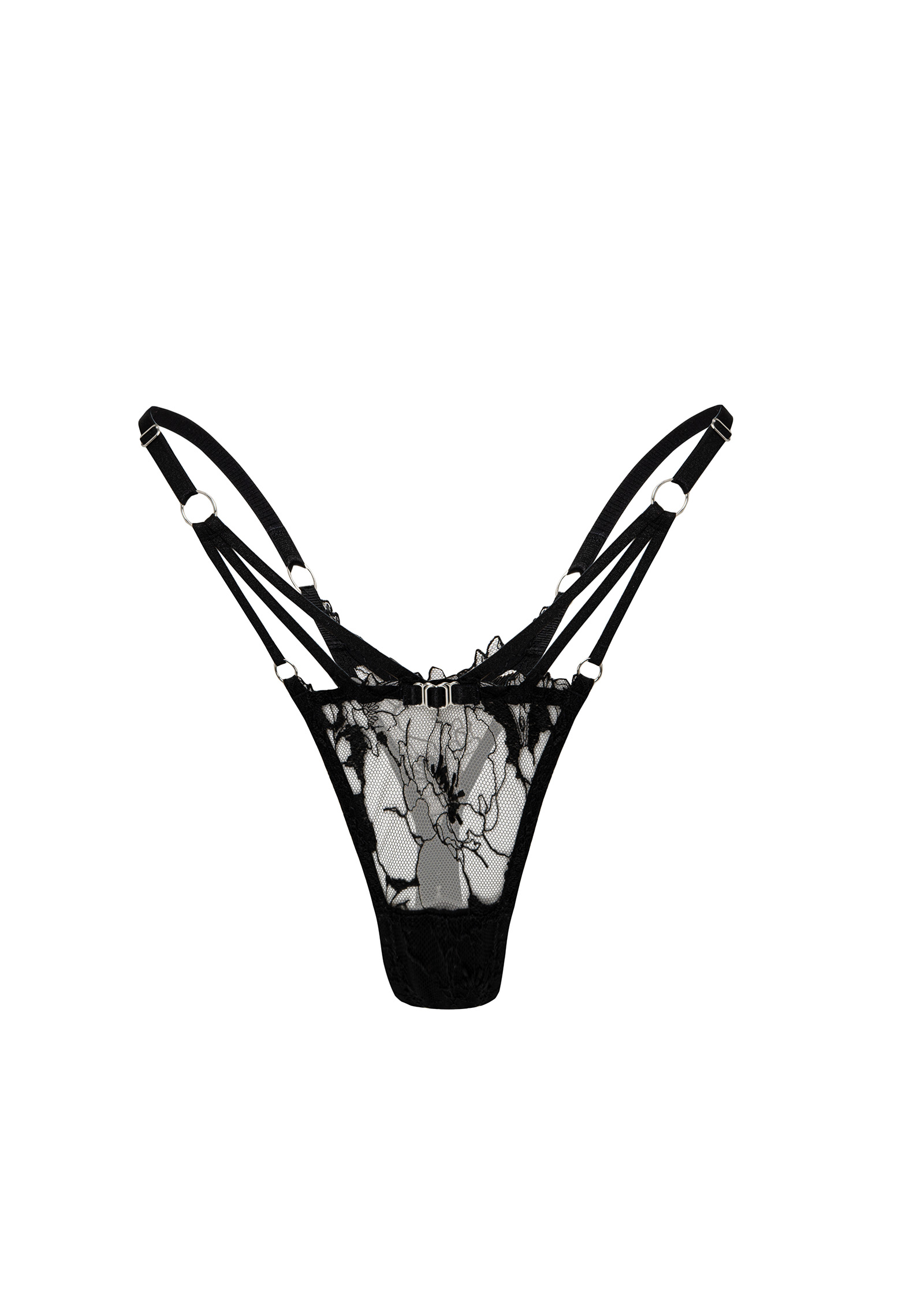 Трусики выполнены из нежного кружева с цветочной вышивкой. Стрепы из мягкой эластичной ленты. Удобная регулировка на бедрах.
